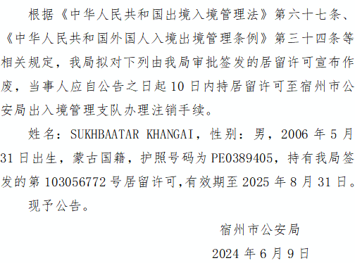 关于决定对蒙古人SUKHBAATARKHANGAI所持居留许可宣布作废的公告
