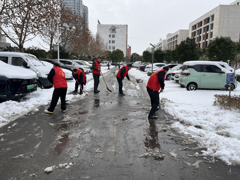 活动伊始,党支部第一时间召开部署会,组建“党员扫雪先锋队”。大家带着铁锹、扫帚等工具,分工明确,冒着凛冽寒风迅速投入战斗。在园区主干道及周边道路等关键路段,大家分工协作、默契配合,干劲十足,有的挥舞铁锹破冰开路,有的手持扫帚清扫积雪,有的合力搬运结块冰雪,重点对陡坡、弯道、台阶等易滑区域进行反复清理,经过数小时的连续奋战,辖区内重点路段的积雪结冰被彻底清除,道路恢复畅通,为居民出行筑牢了安全防线。