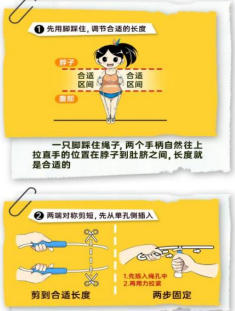 1.绳长调节。拉出绳体至最长,观察调节扣是否锁死,避免跳绳时回缩。