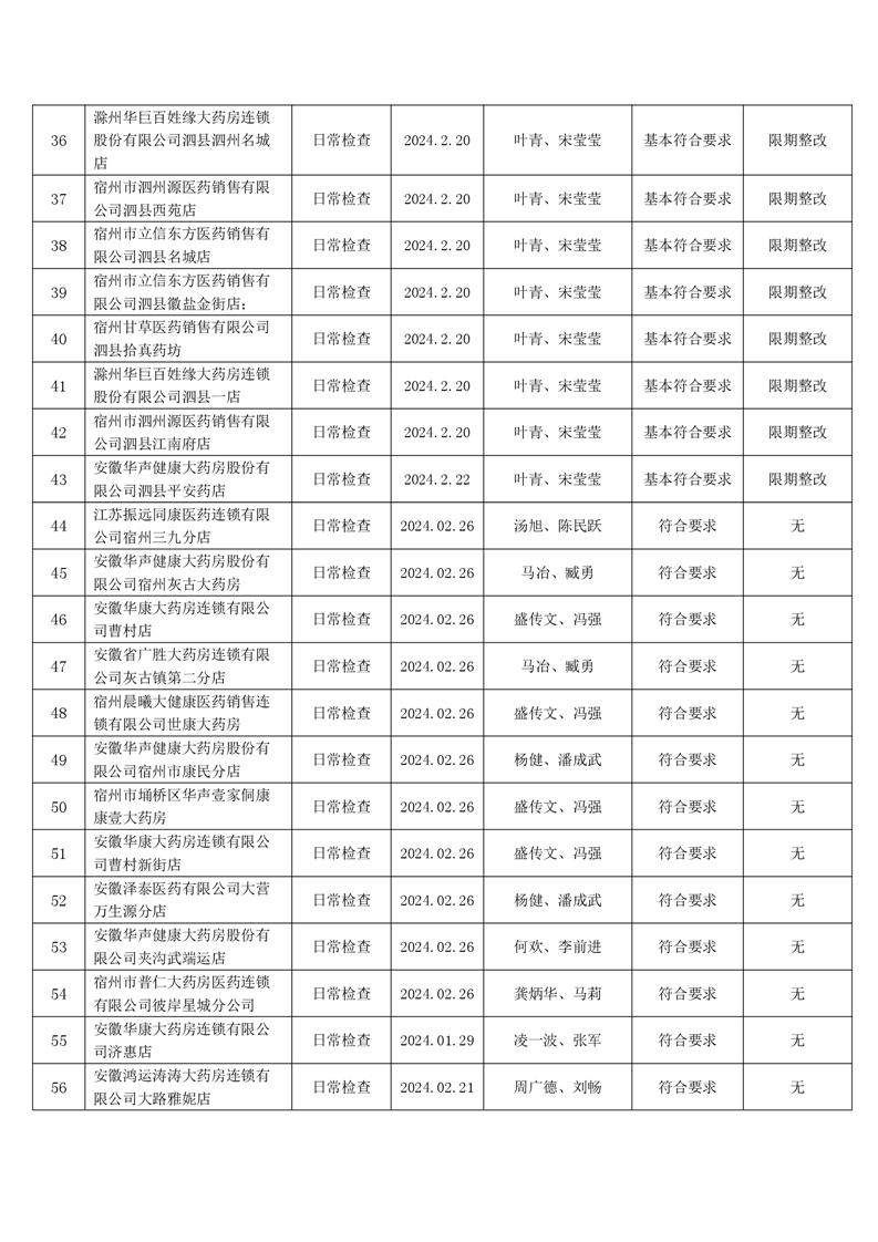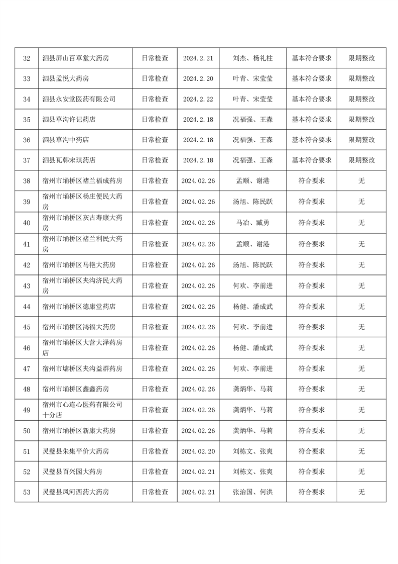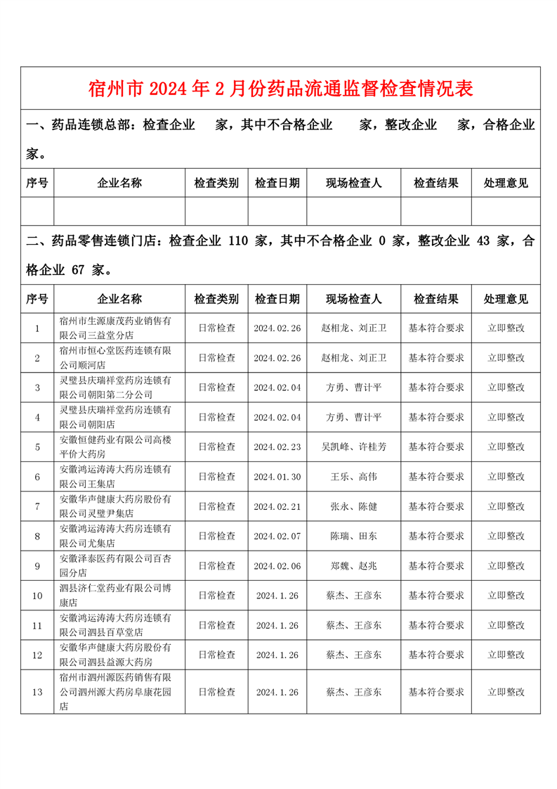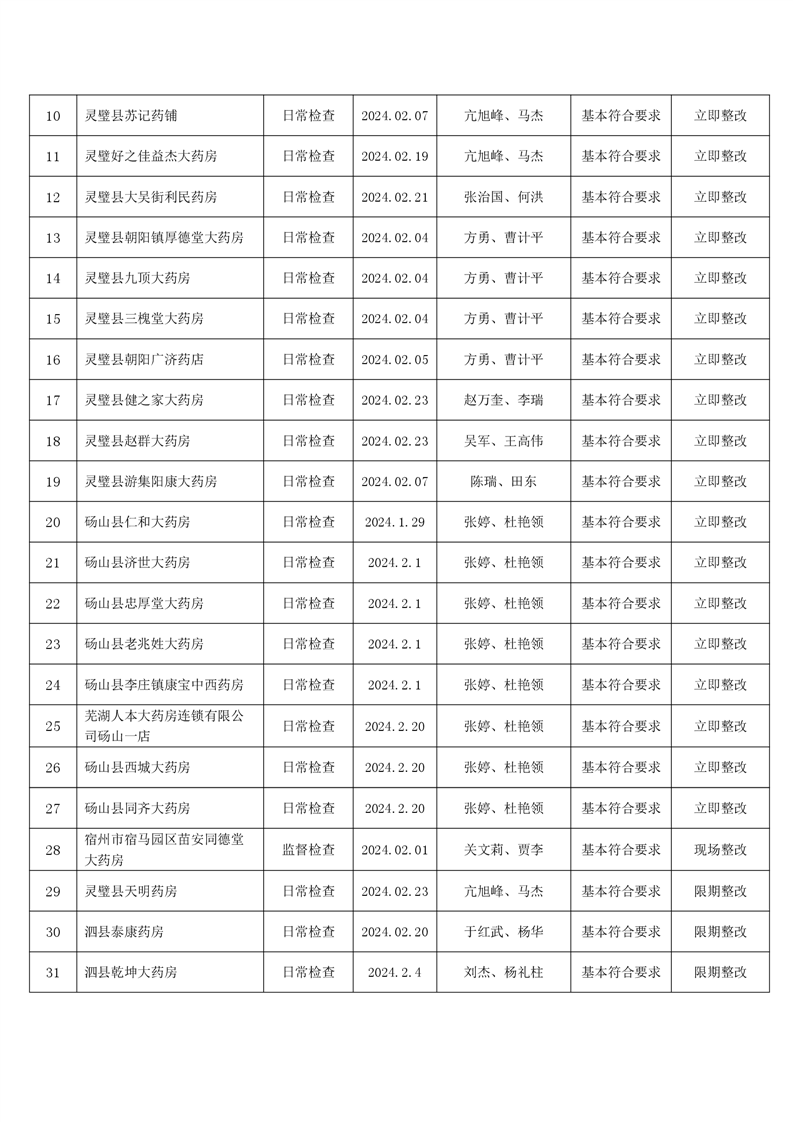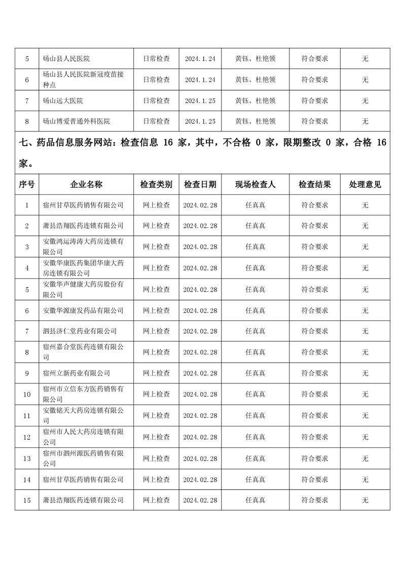 宿州市2024年2月份药品流通监督检查情况表