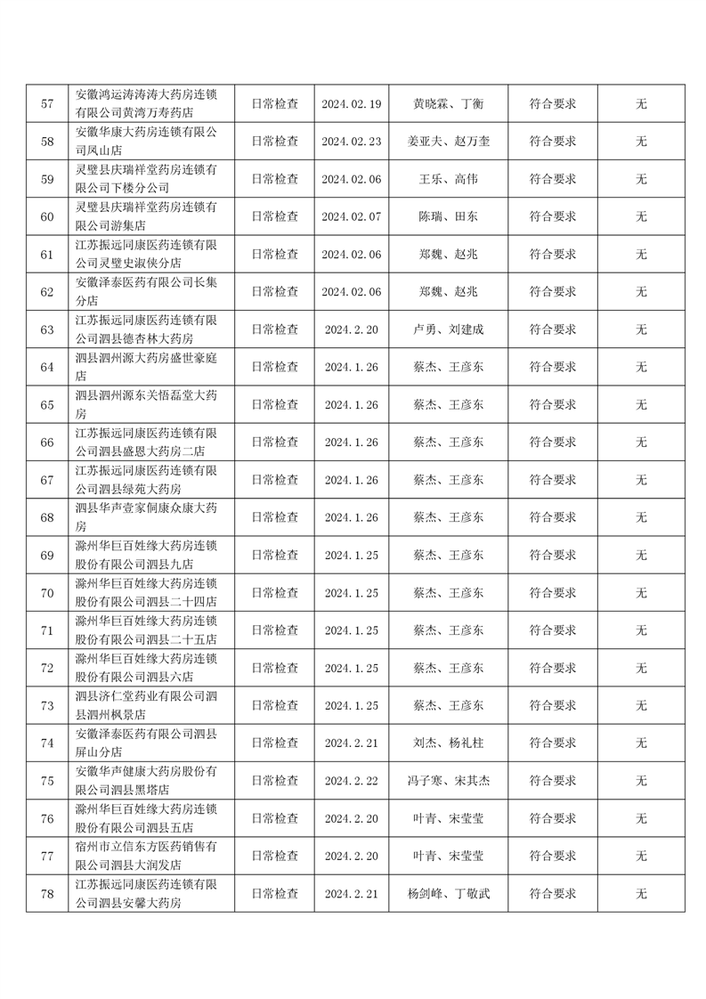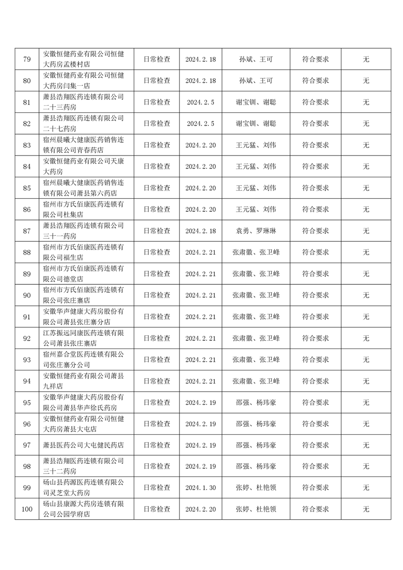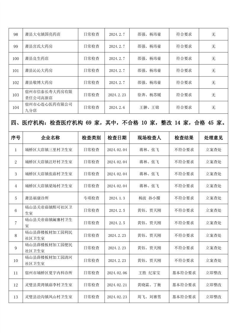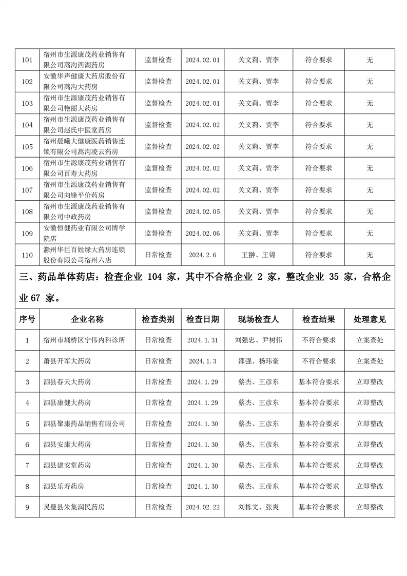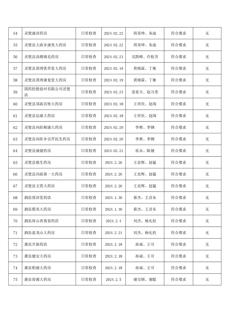 宿州市2024年2月份药品流通监督检查情况表