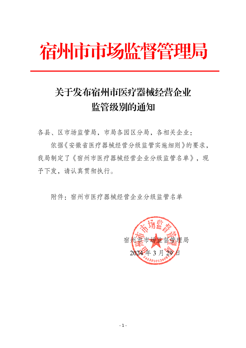 关于发布宿州市医疗器械经营企业监管级别的通知