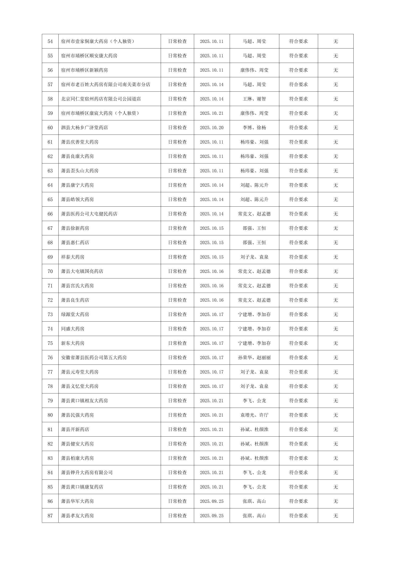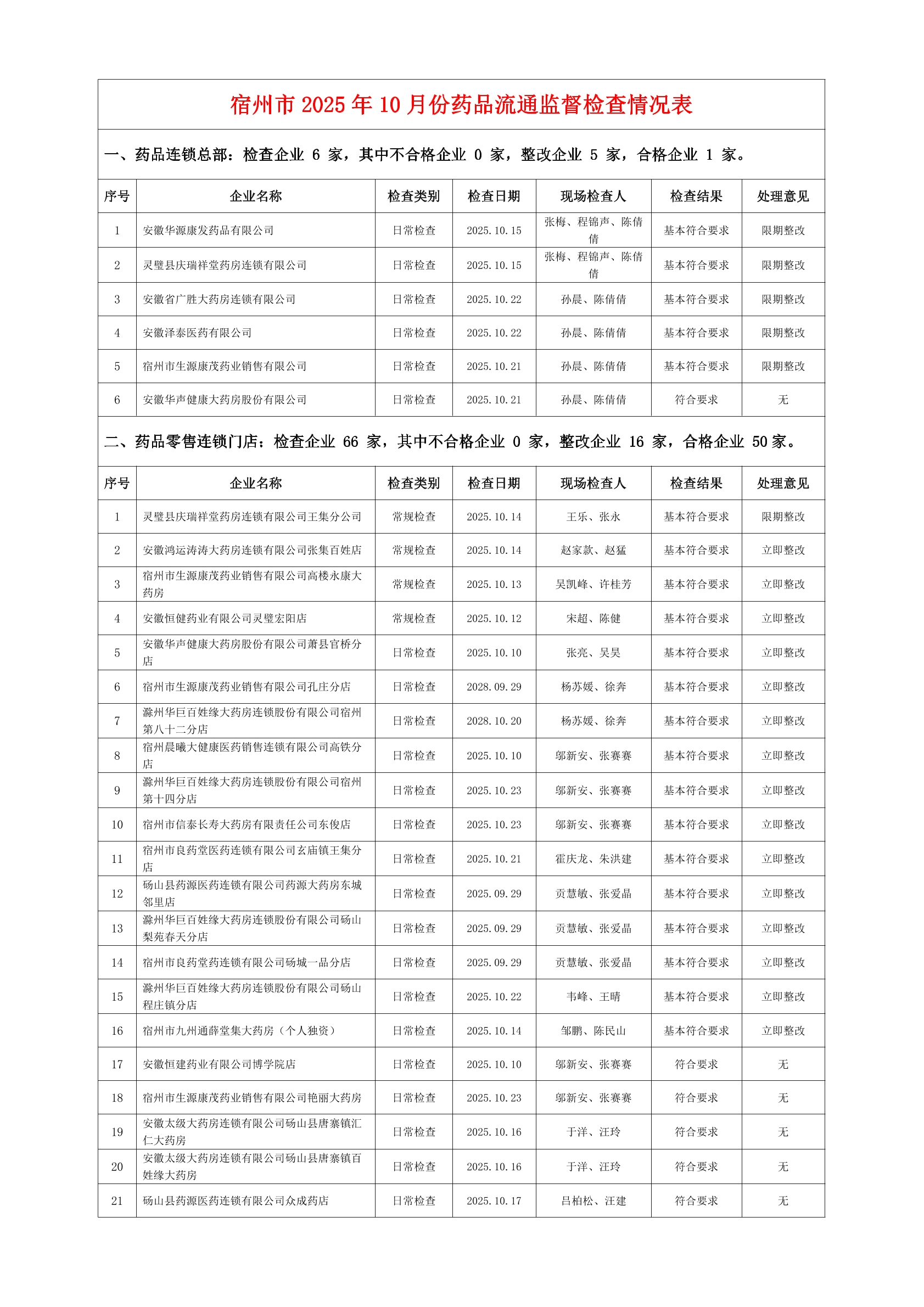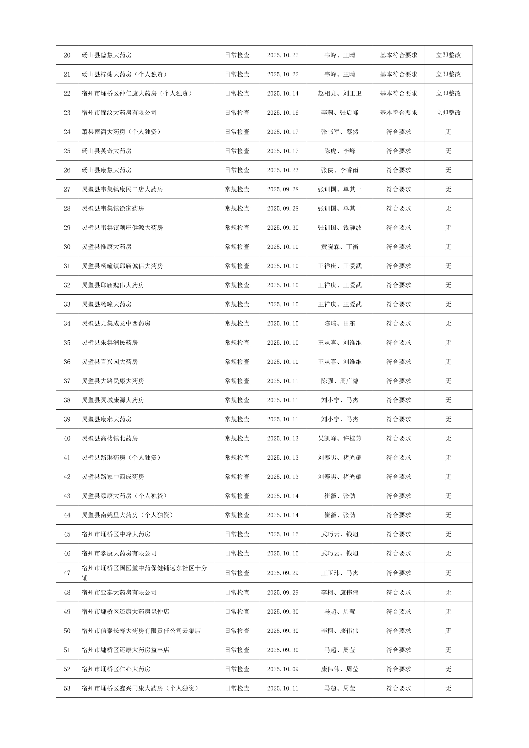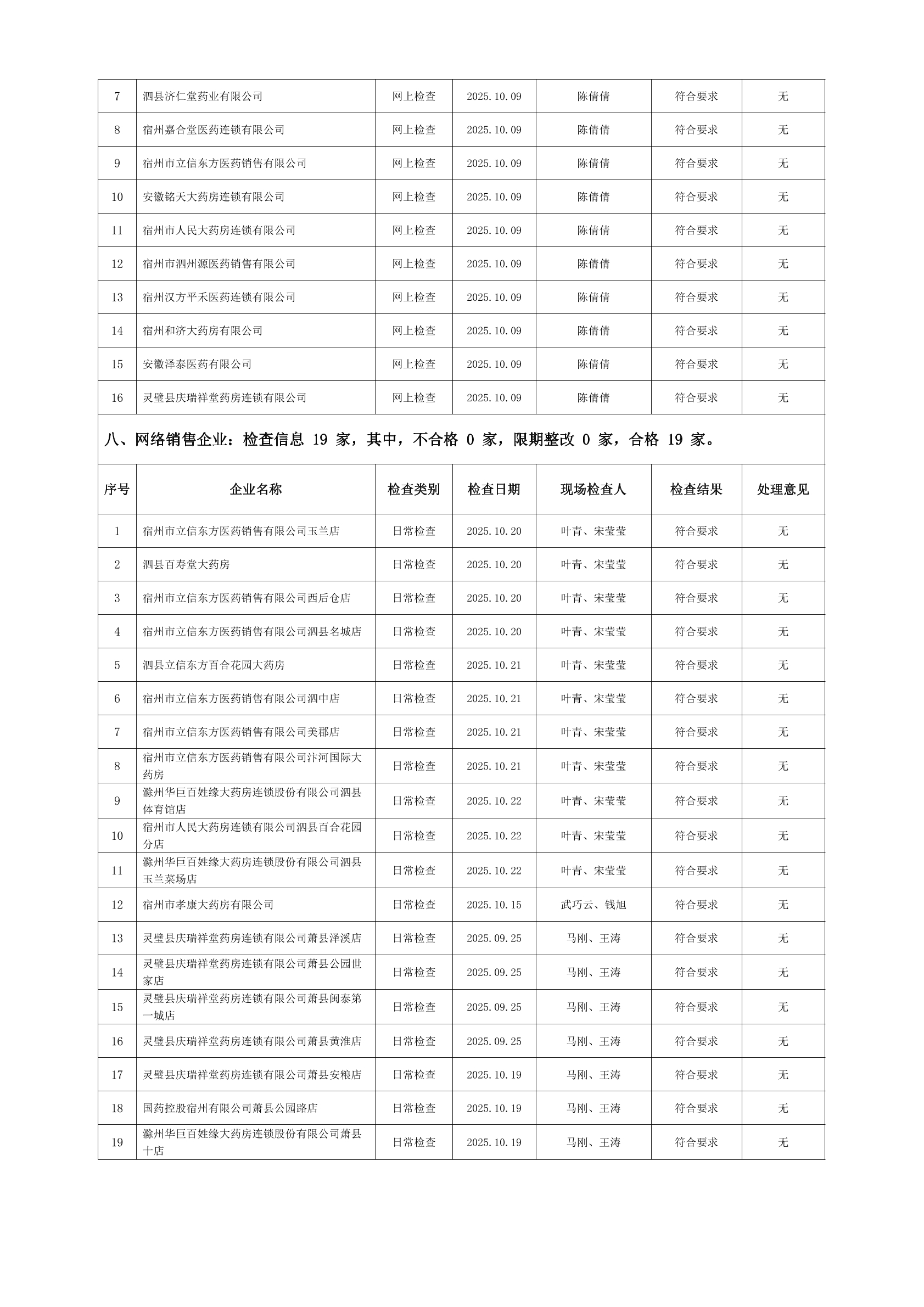 宿州市2025年10月份药品流通监督检查情况表