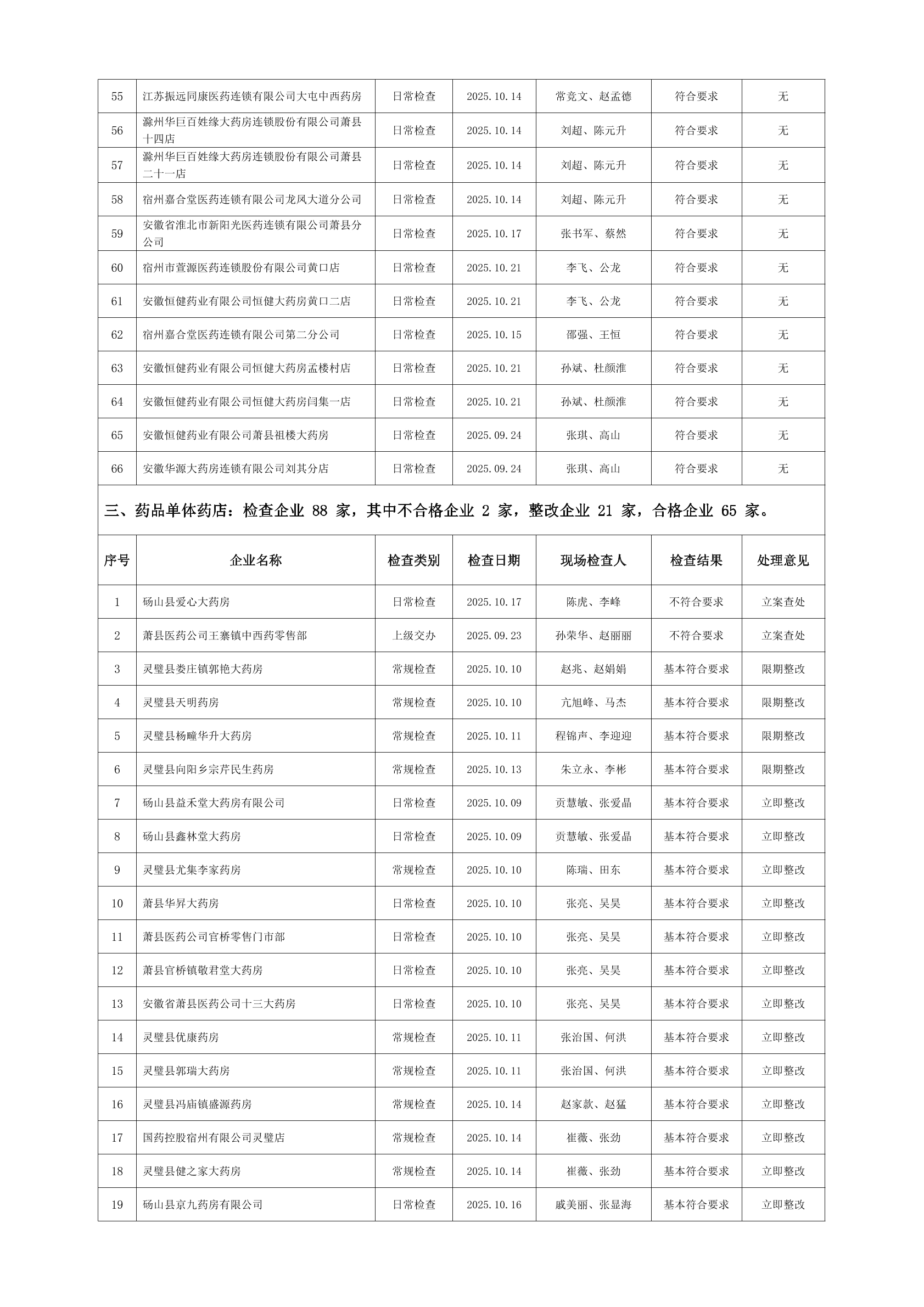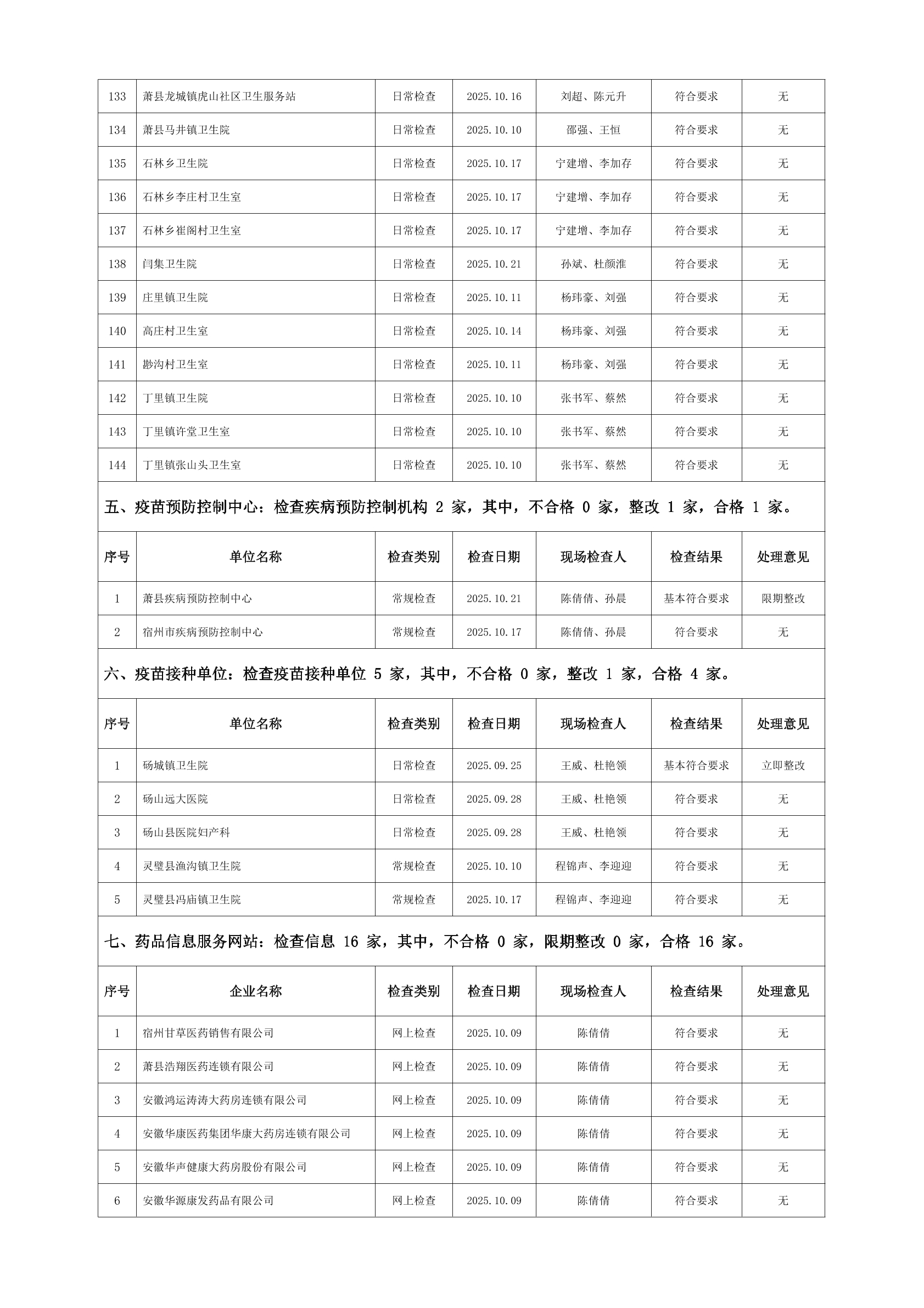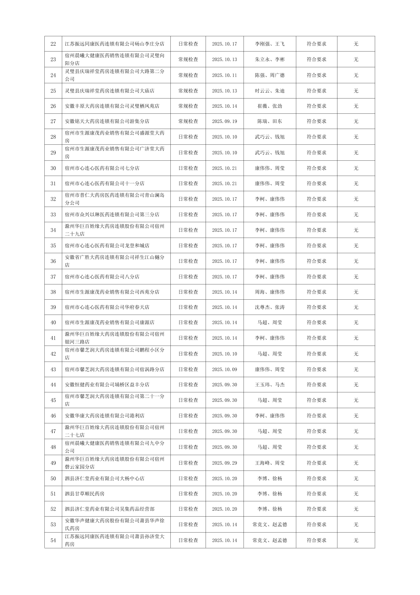 宿州市2025年10月份药品流通监督检查情况表