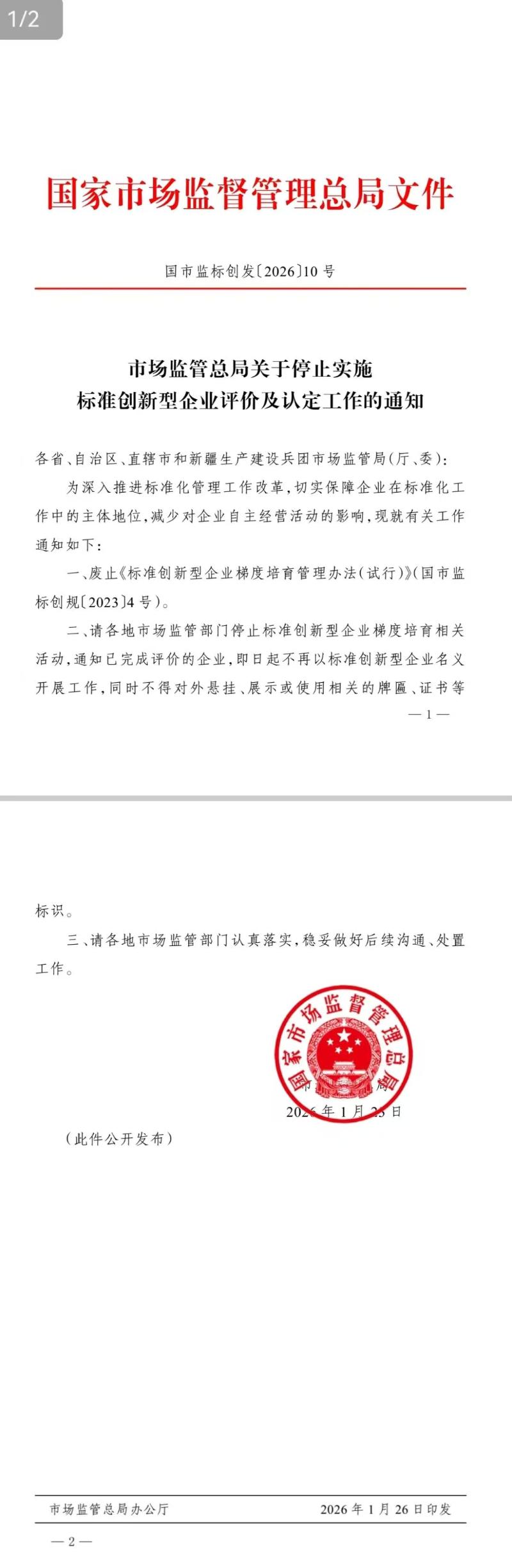 为深入推进标准化管理工作改革,保障企业在标准化工作中的主体地位,根据国家总局通知,《标准创新型企业梯度培育管理办法(试行)》(国市监标创规[2023]4号)正式废止。各县(市、区)市场监管部门须立即停止标准创新型企业梯度培育、申报受理、评审认定等所有相关活动,已启动流程的一律终止。