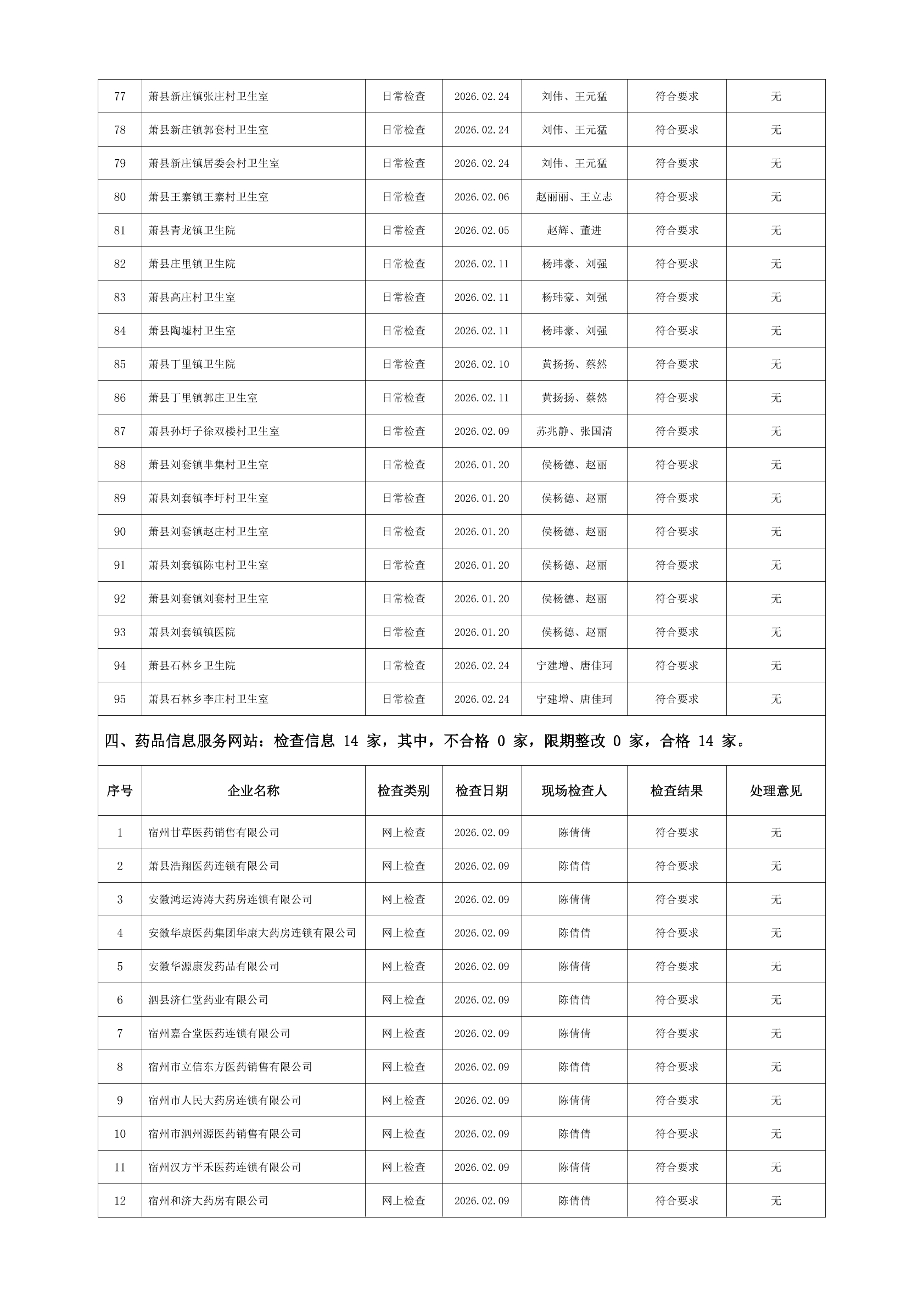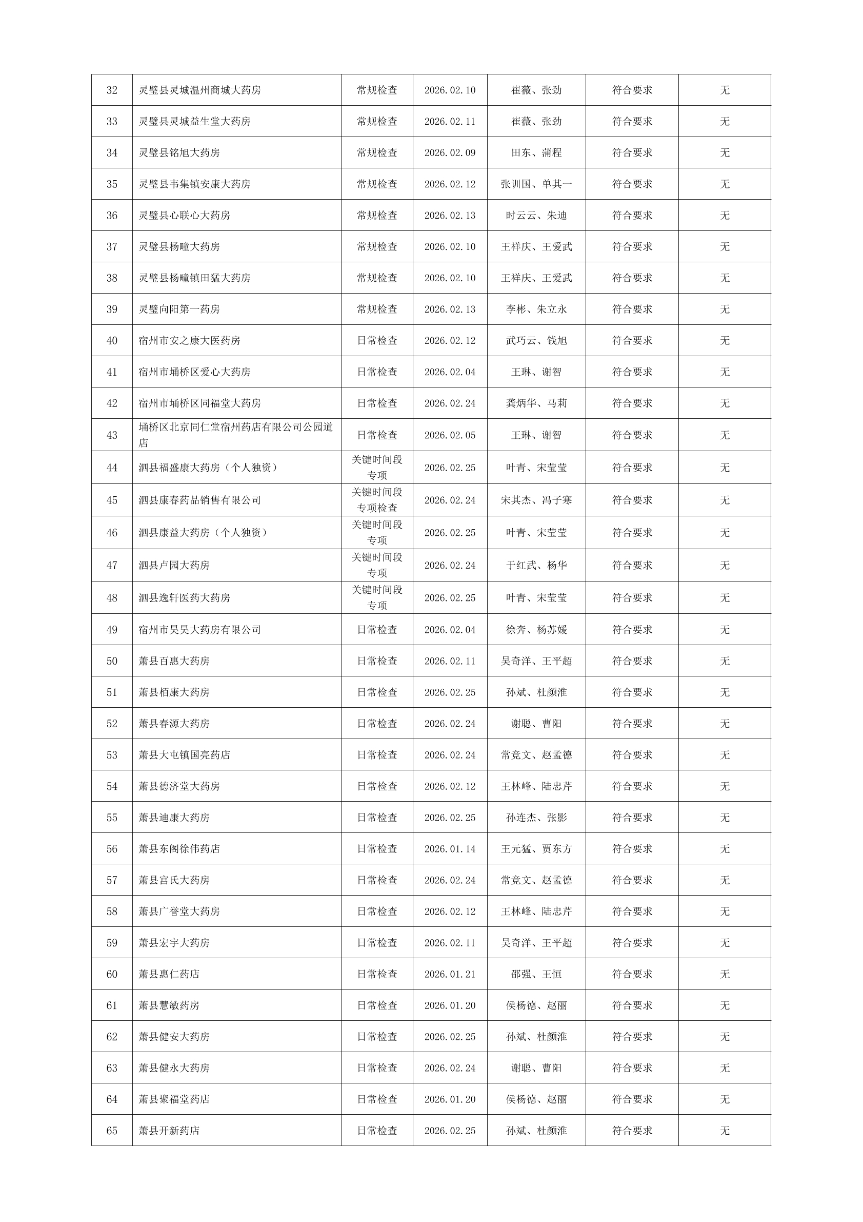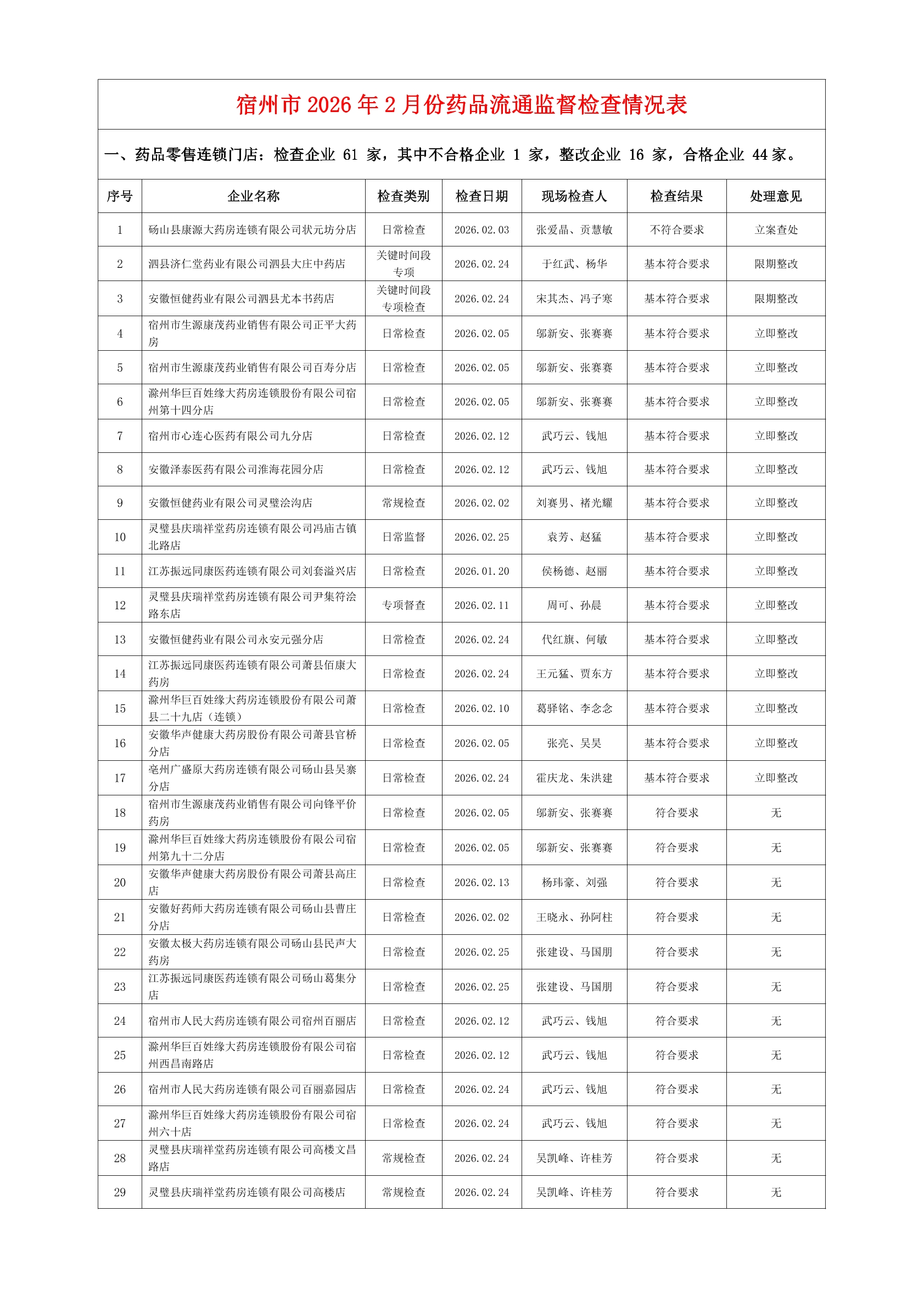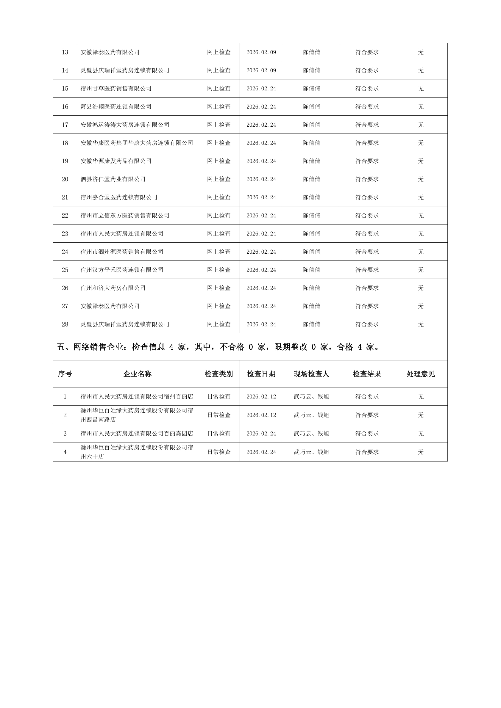 宿州市2026年2月份药品流通监督检查情况表