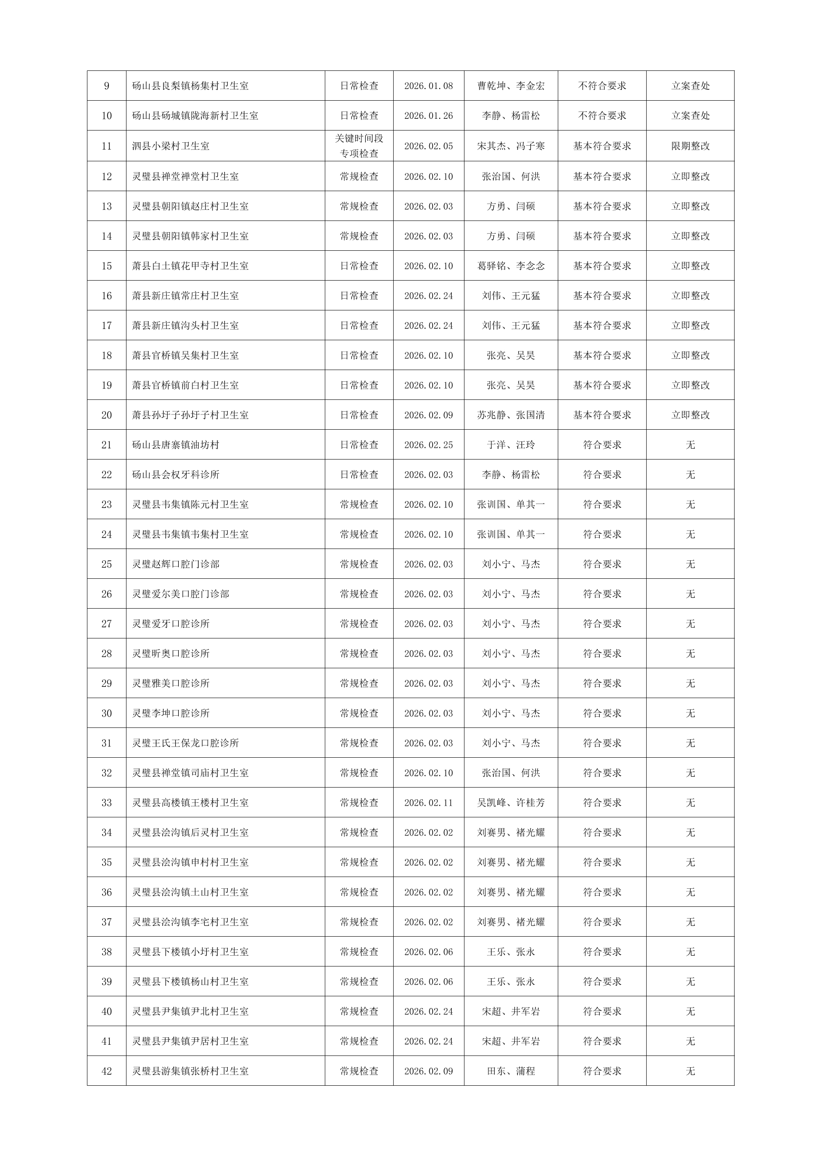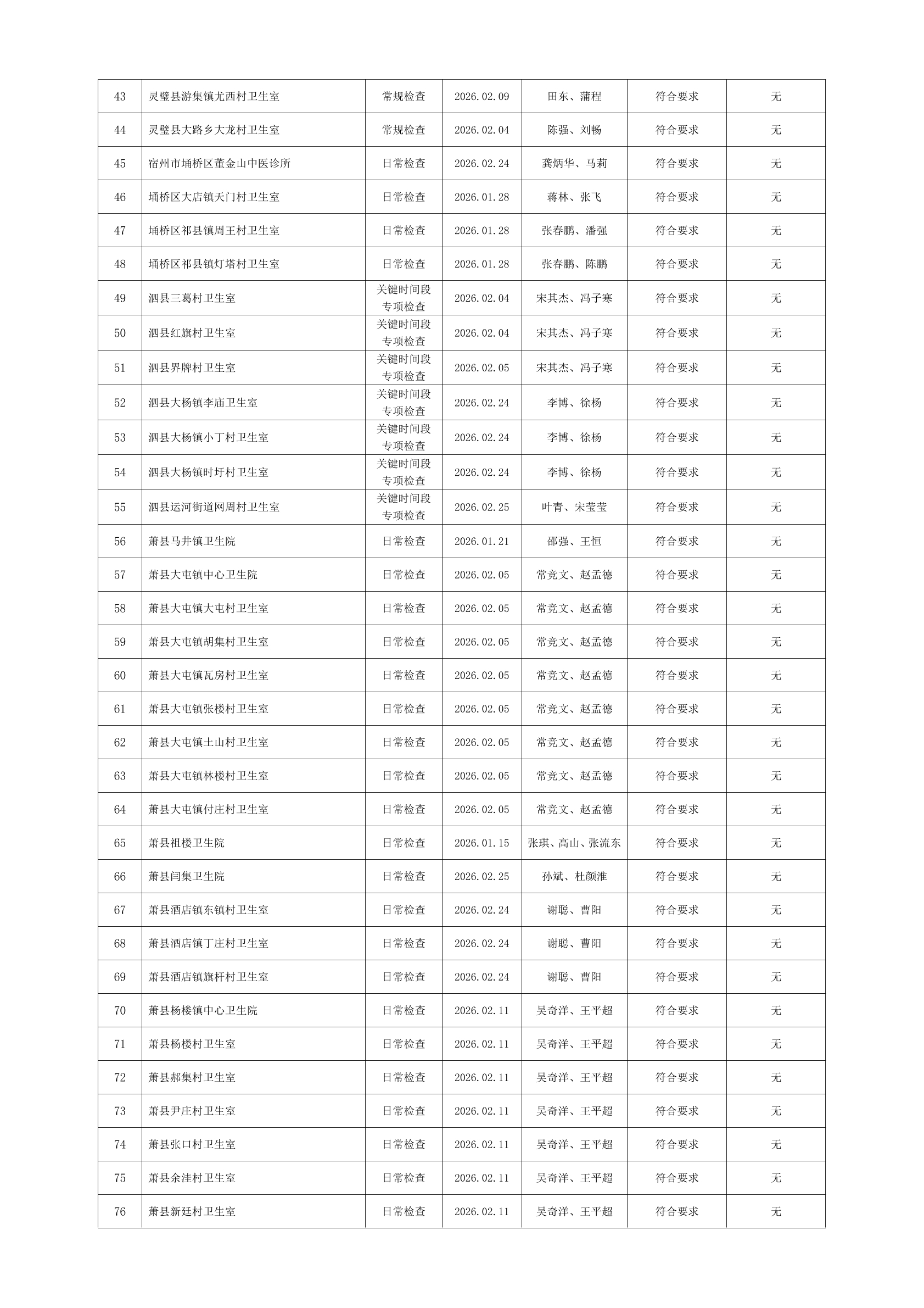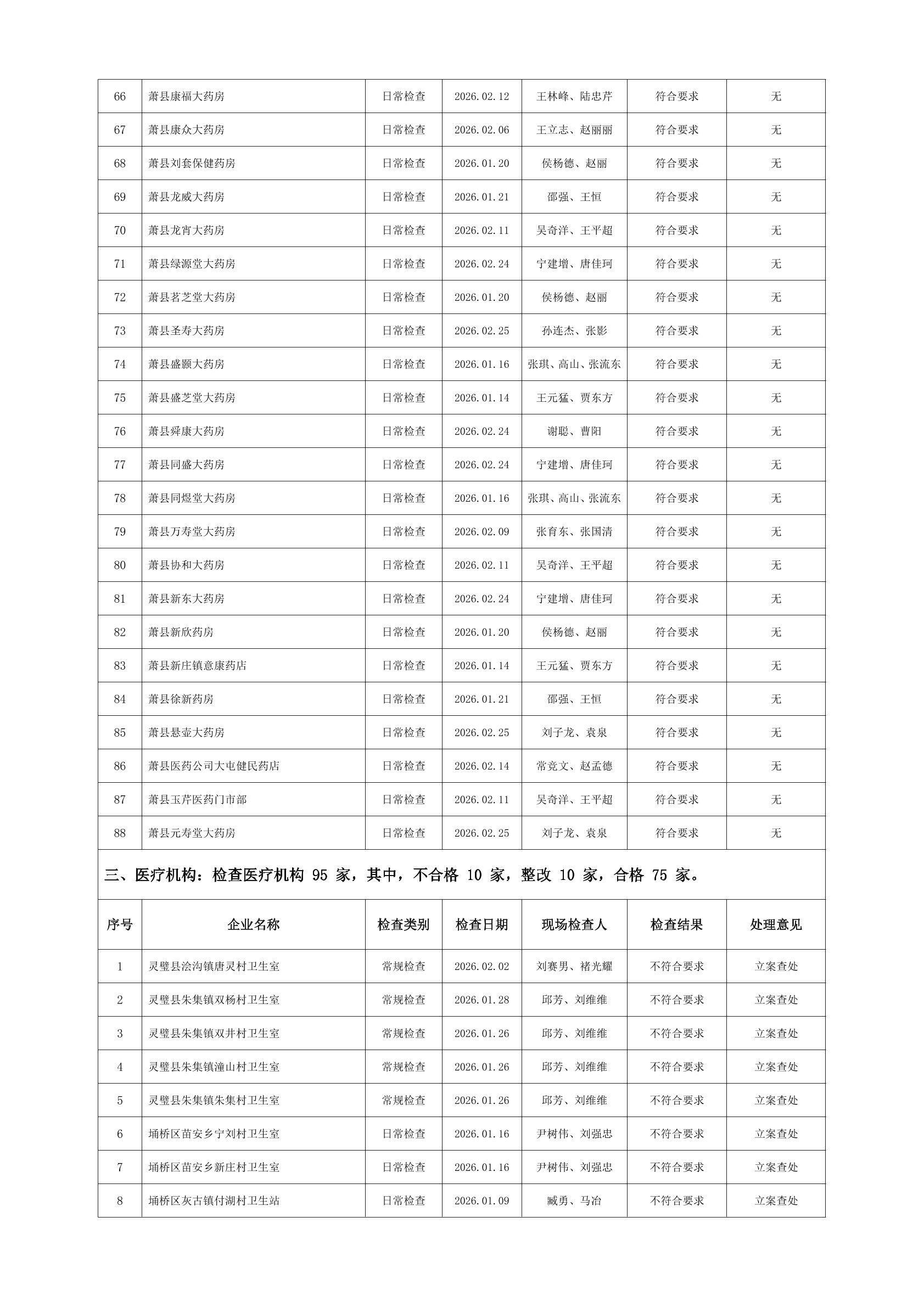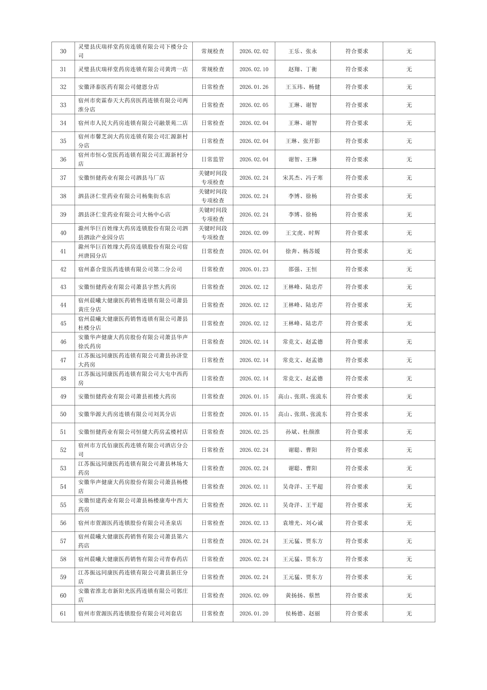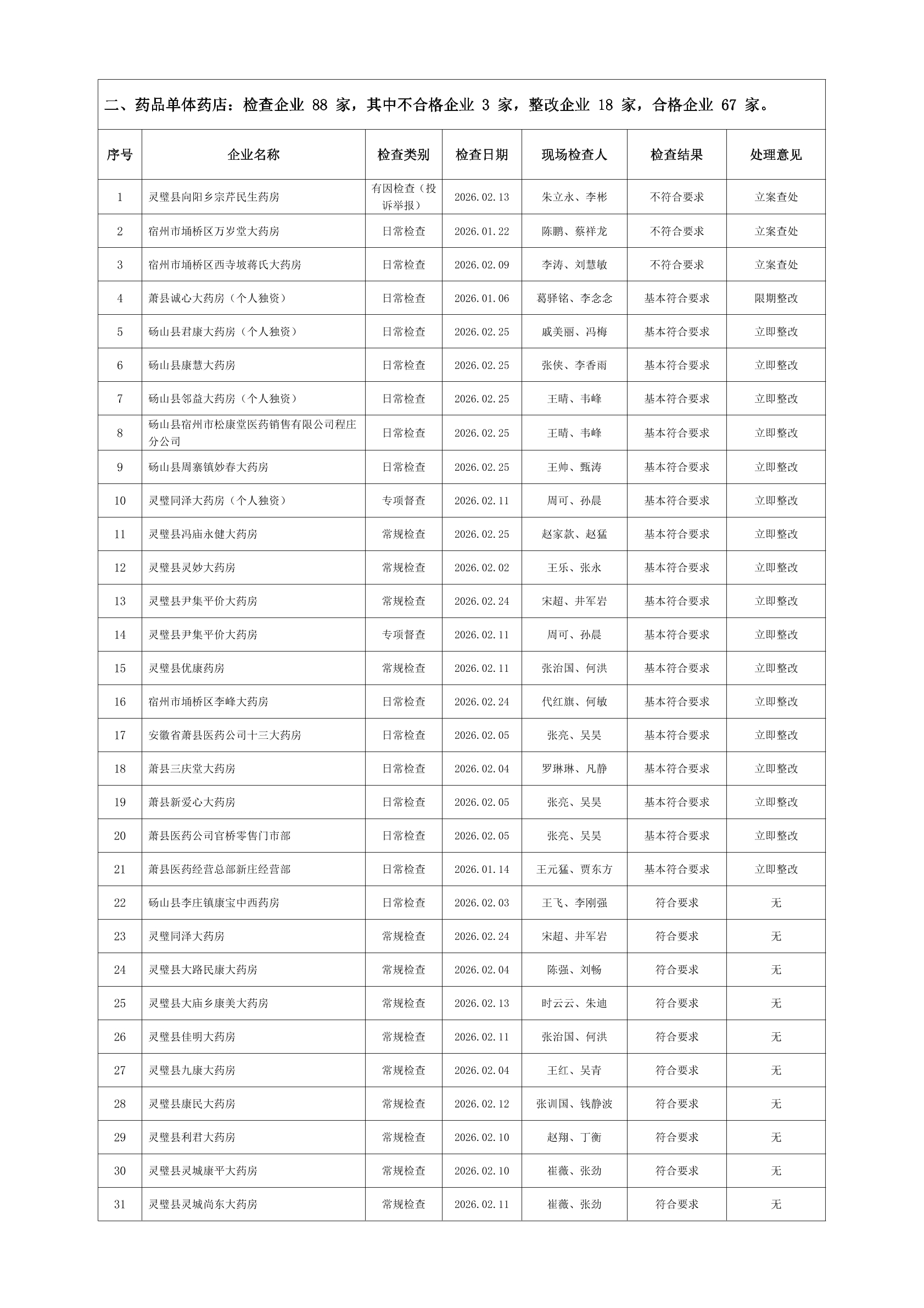宿州市2026年2月份药品流通监督检查情况表
