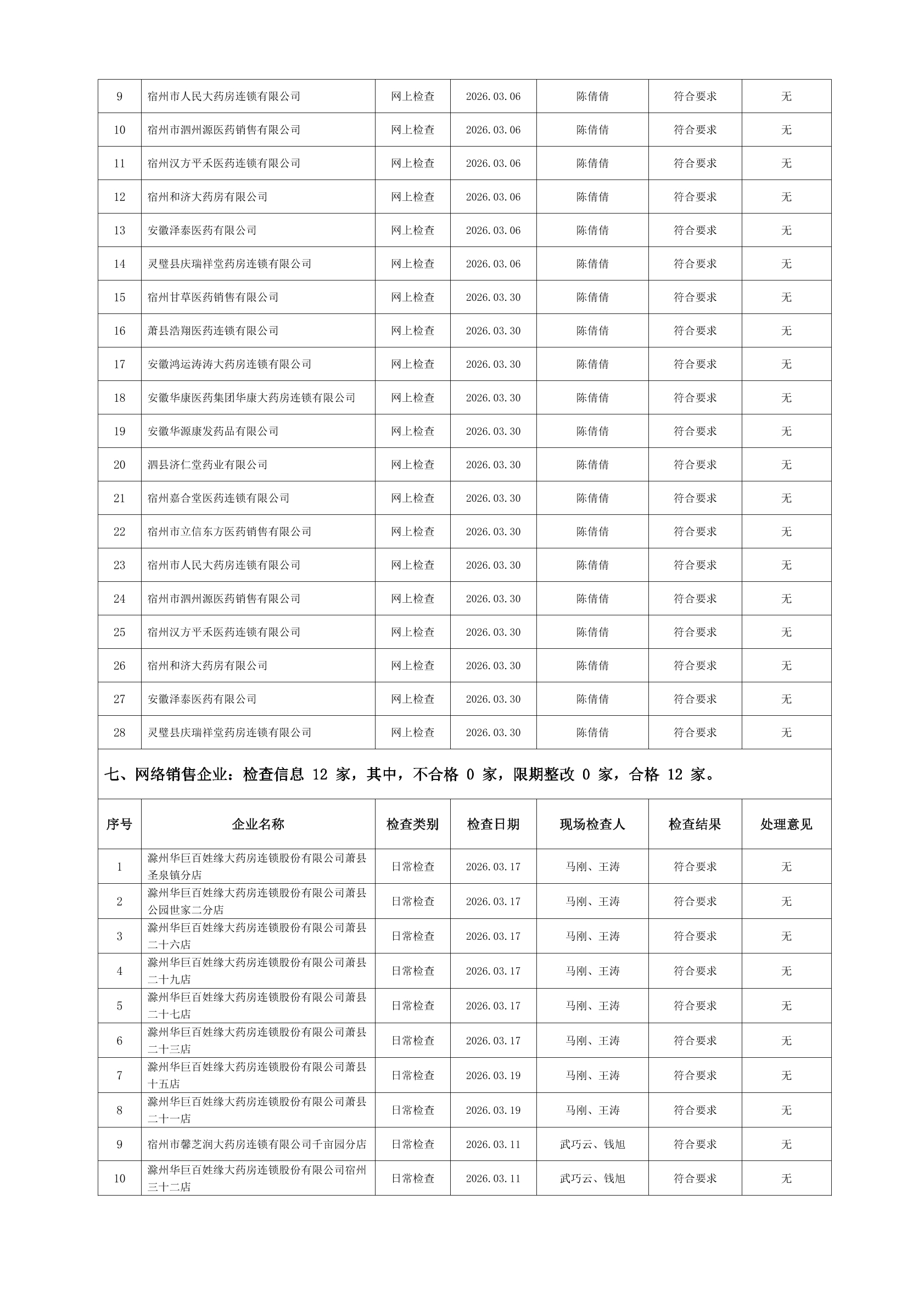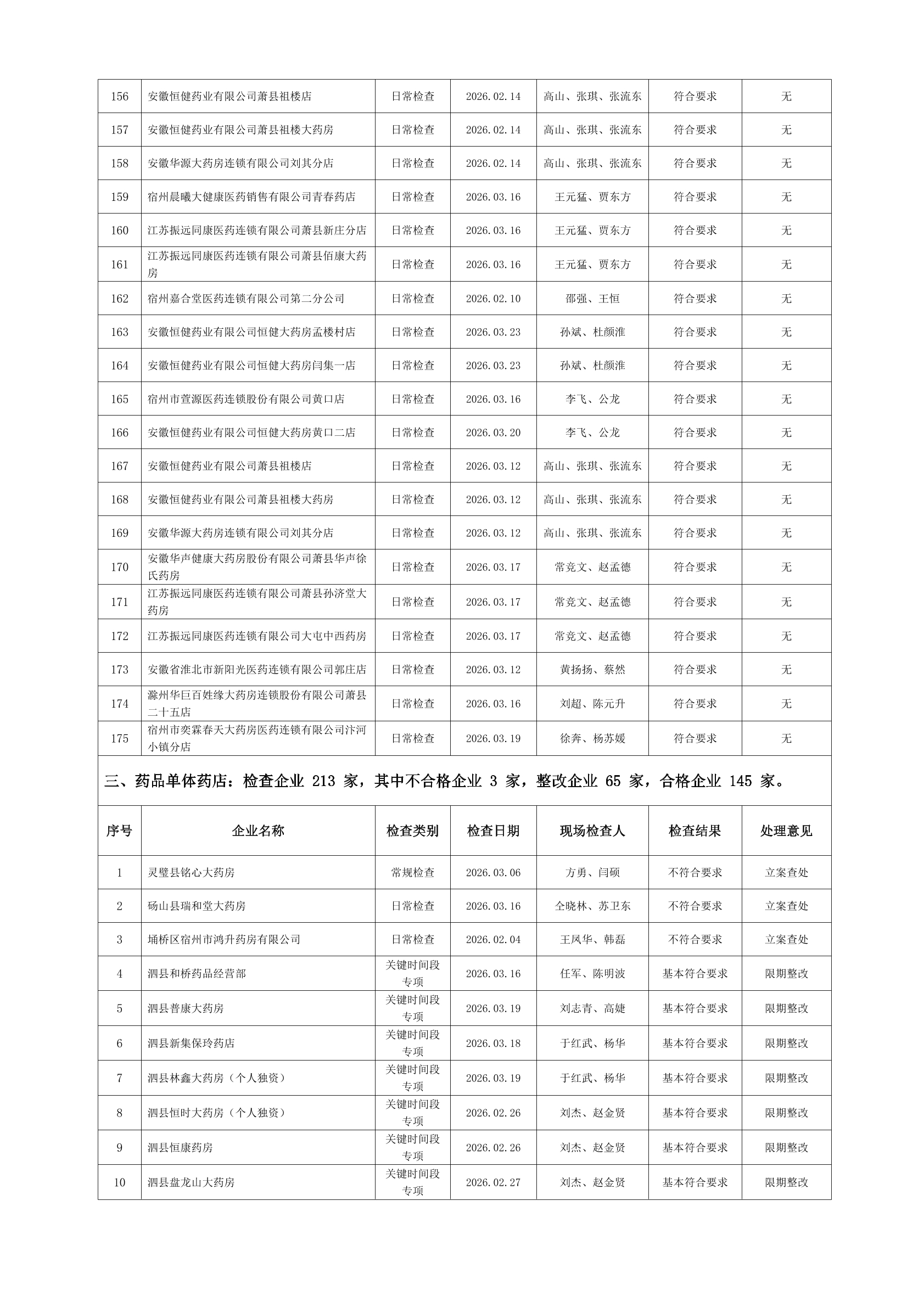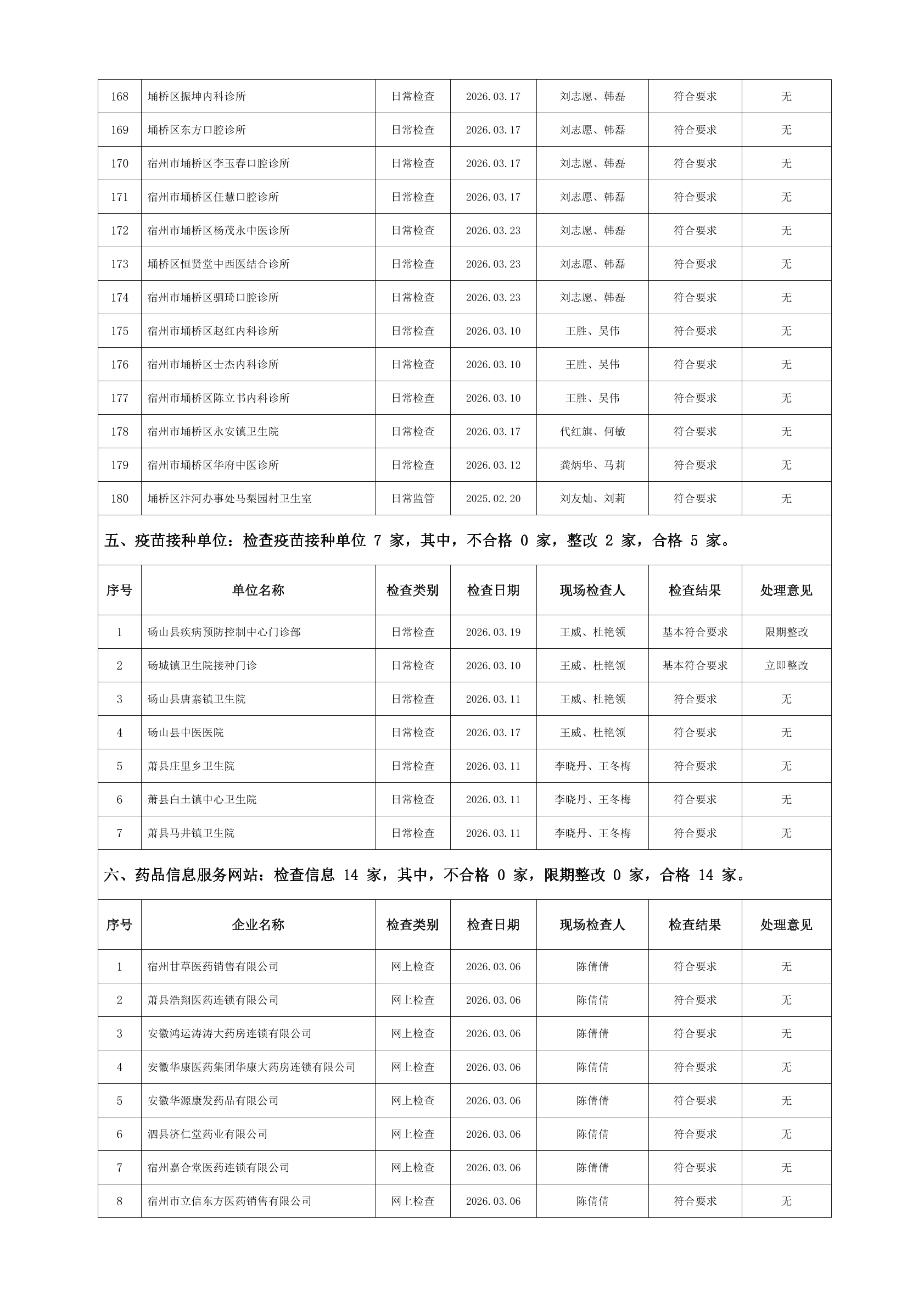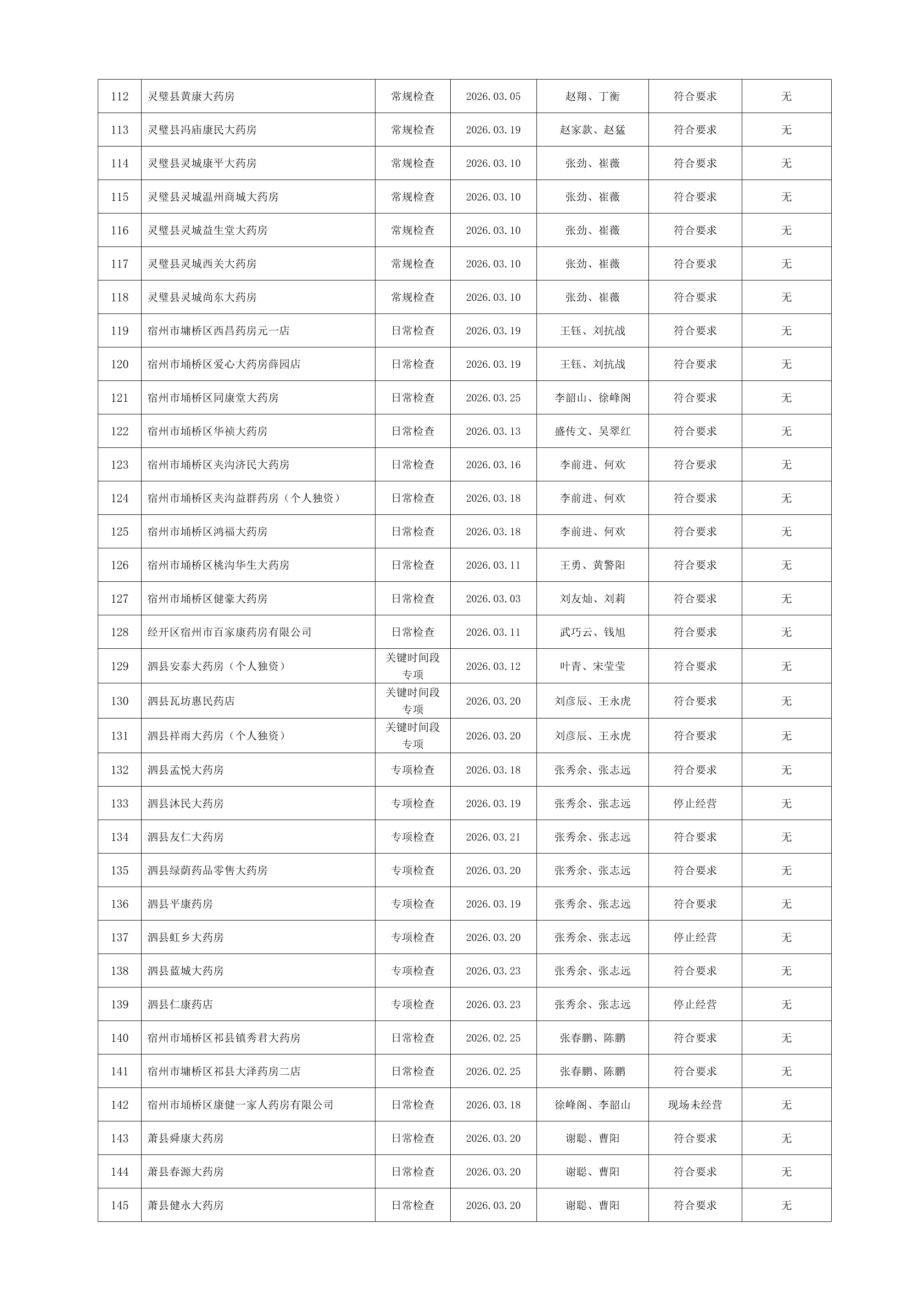 宿州市2026年3月份药品流通监督检查情况表