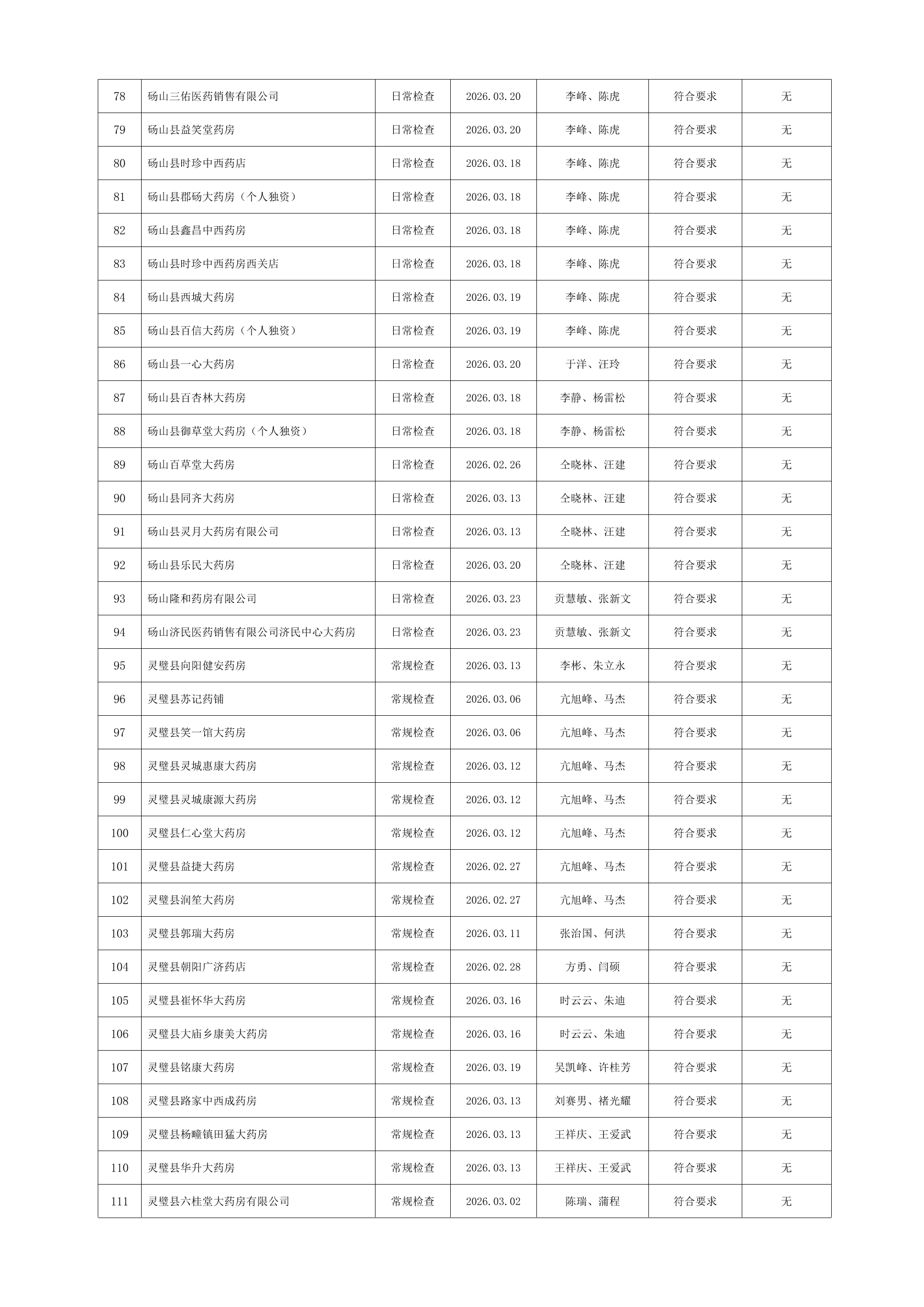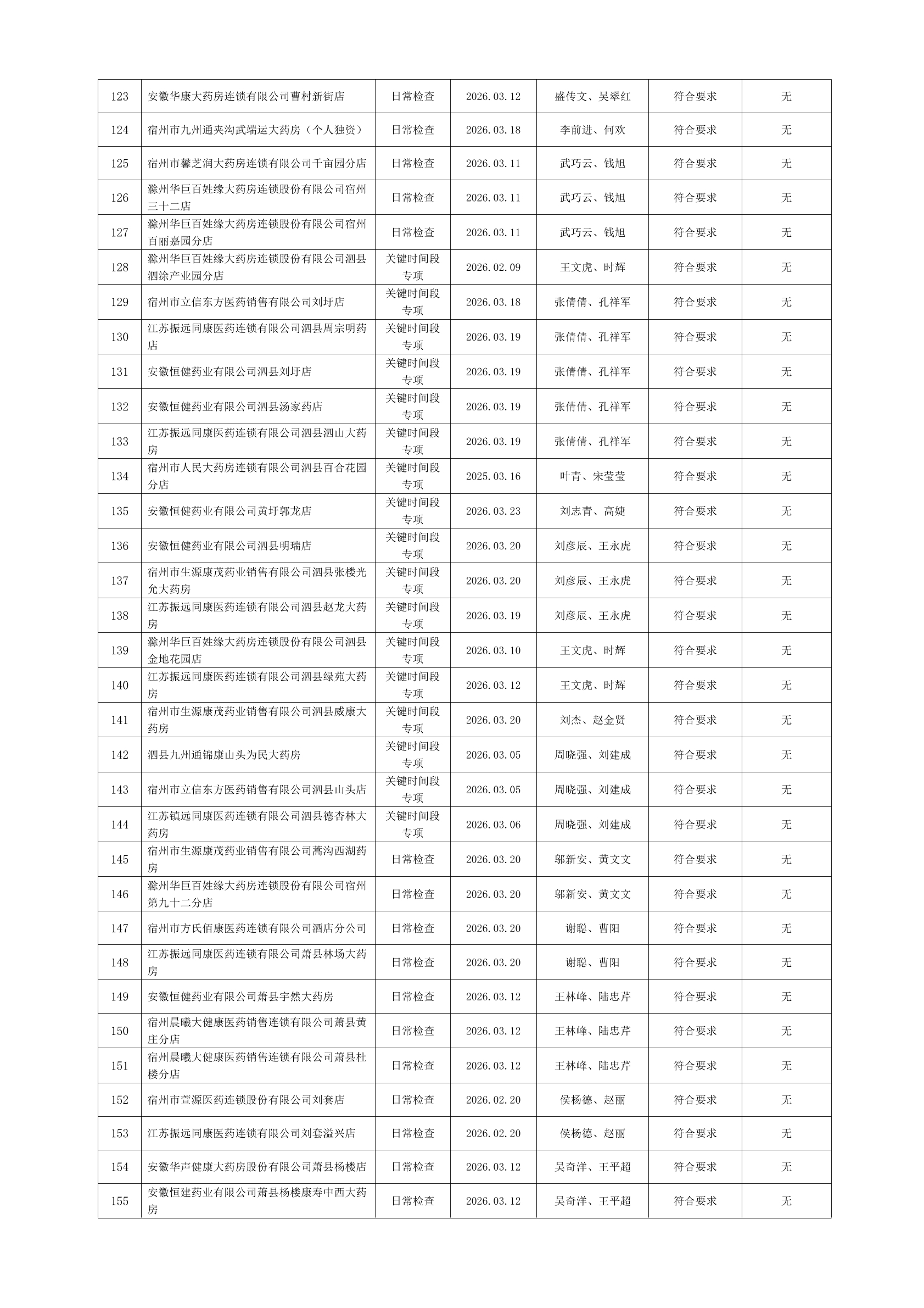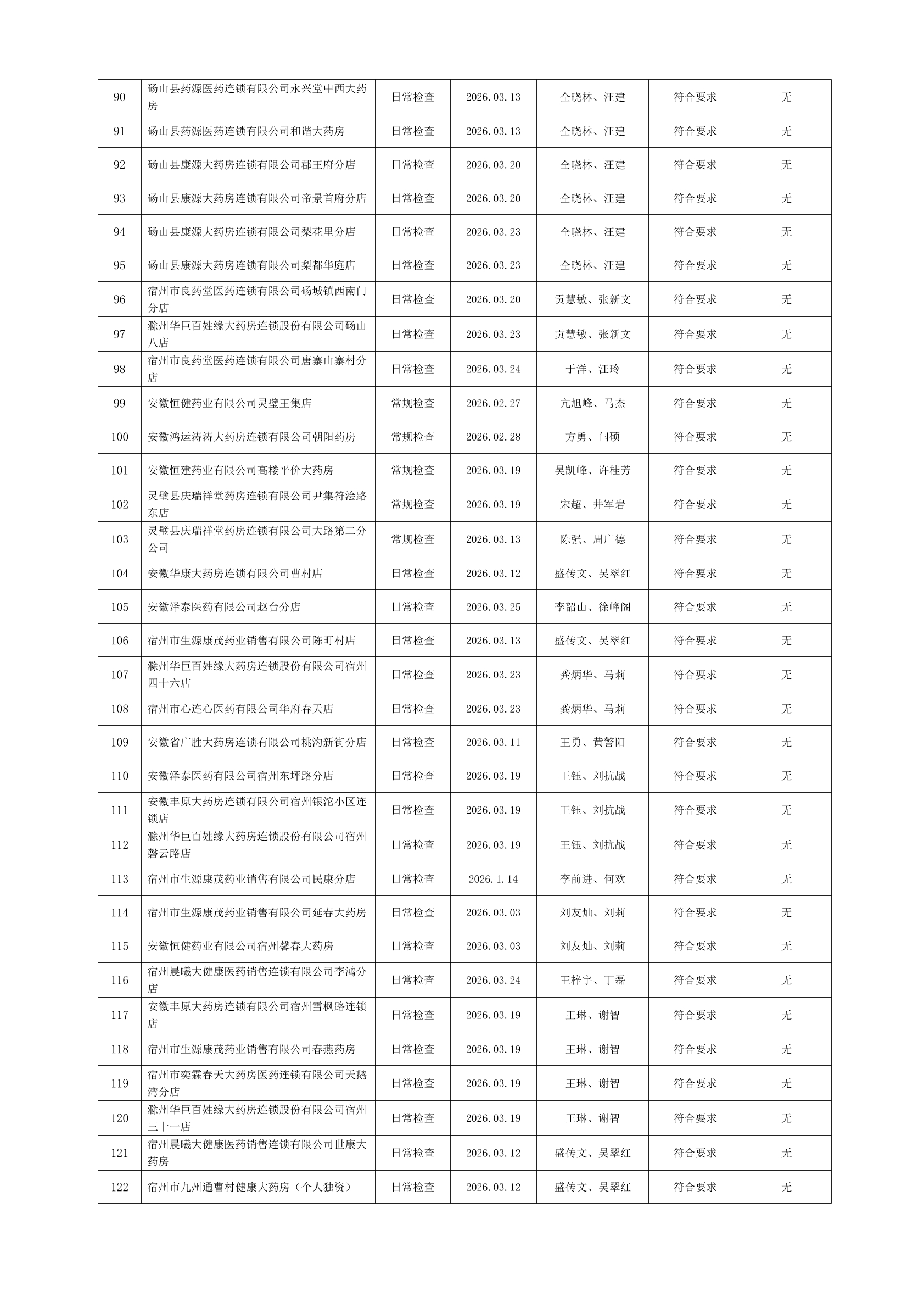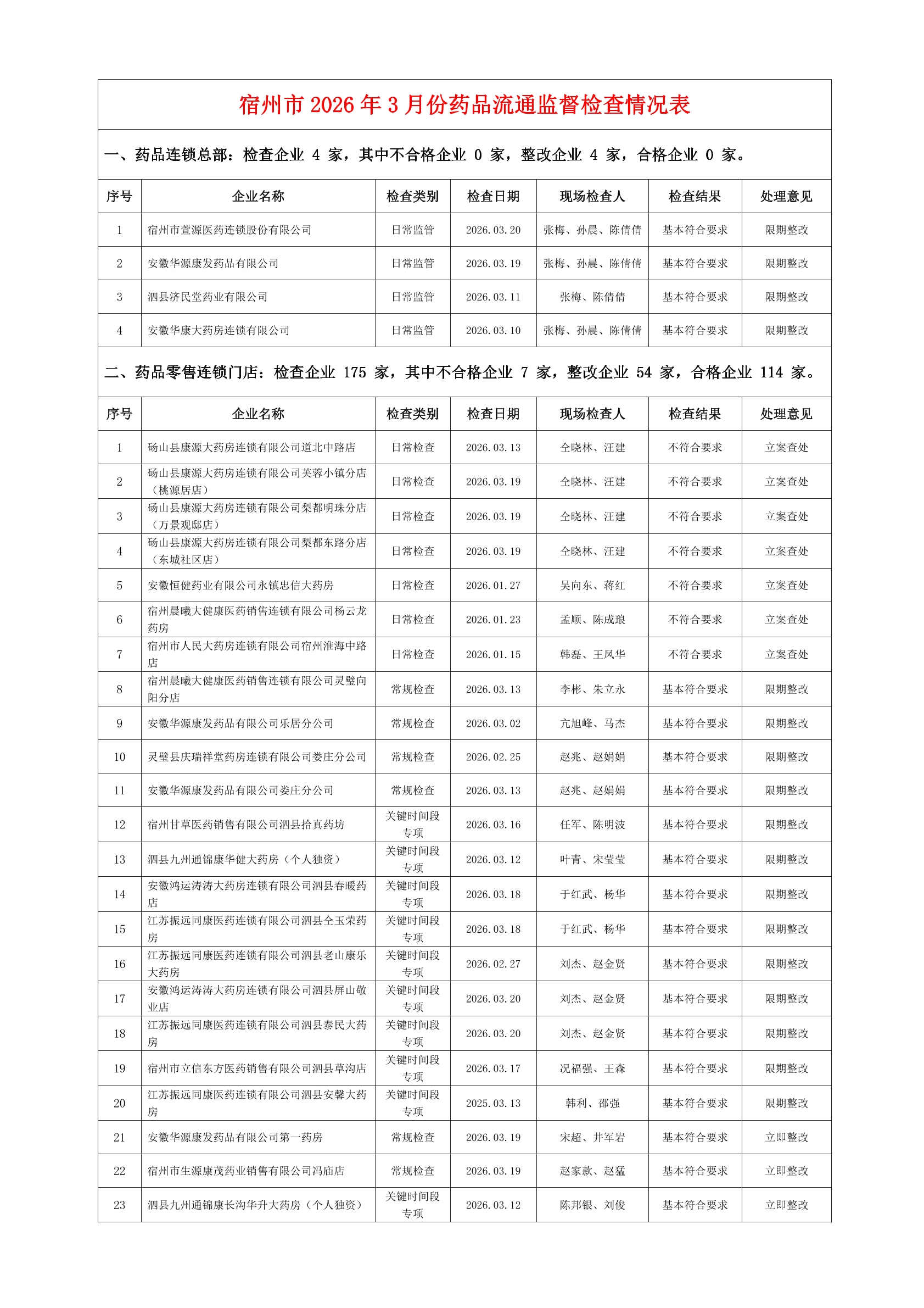宿州市2026年3月份药品流通监督检查情况表