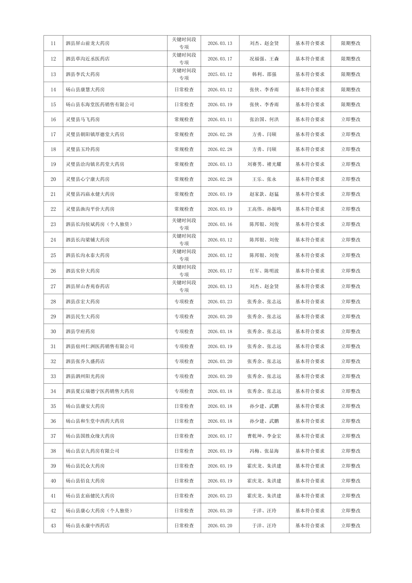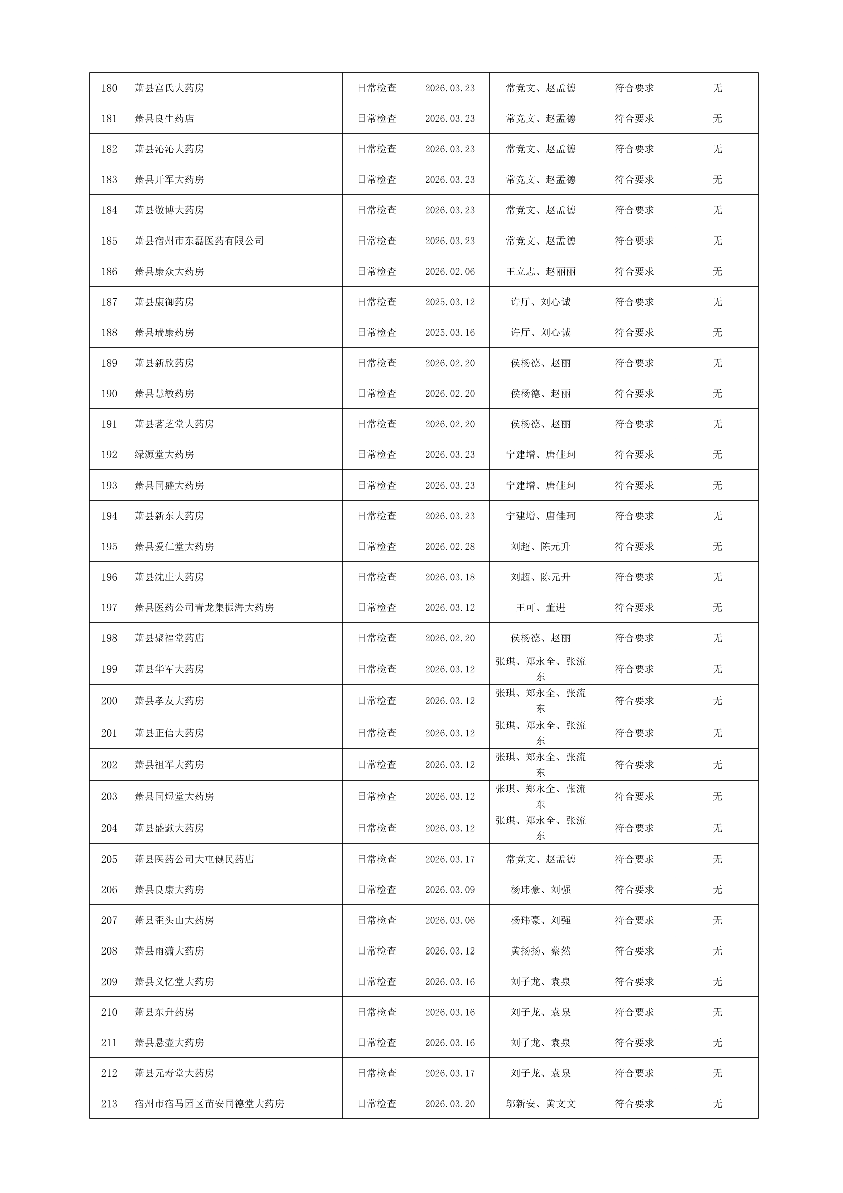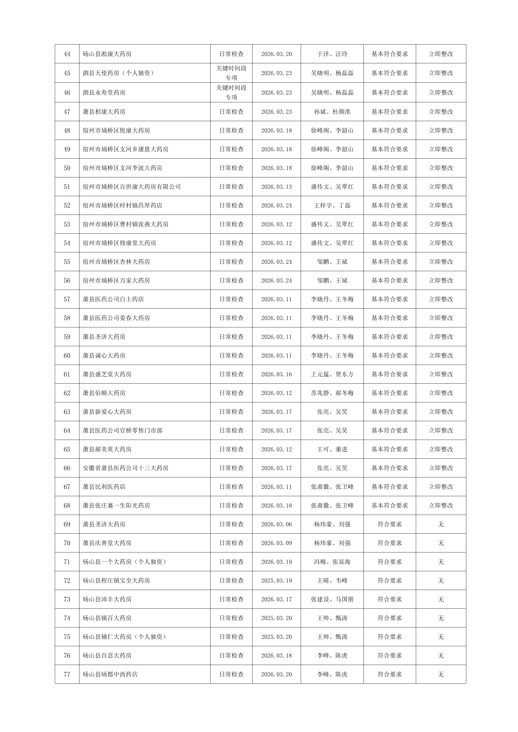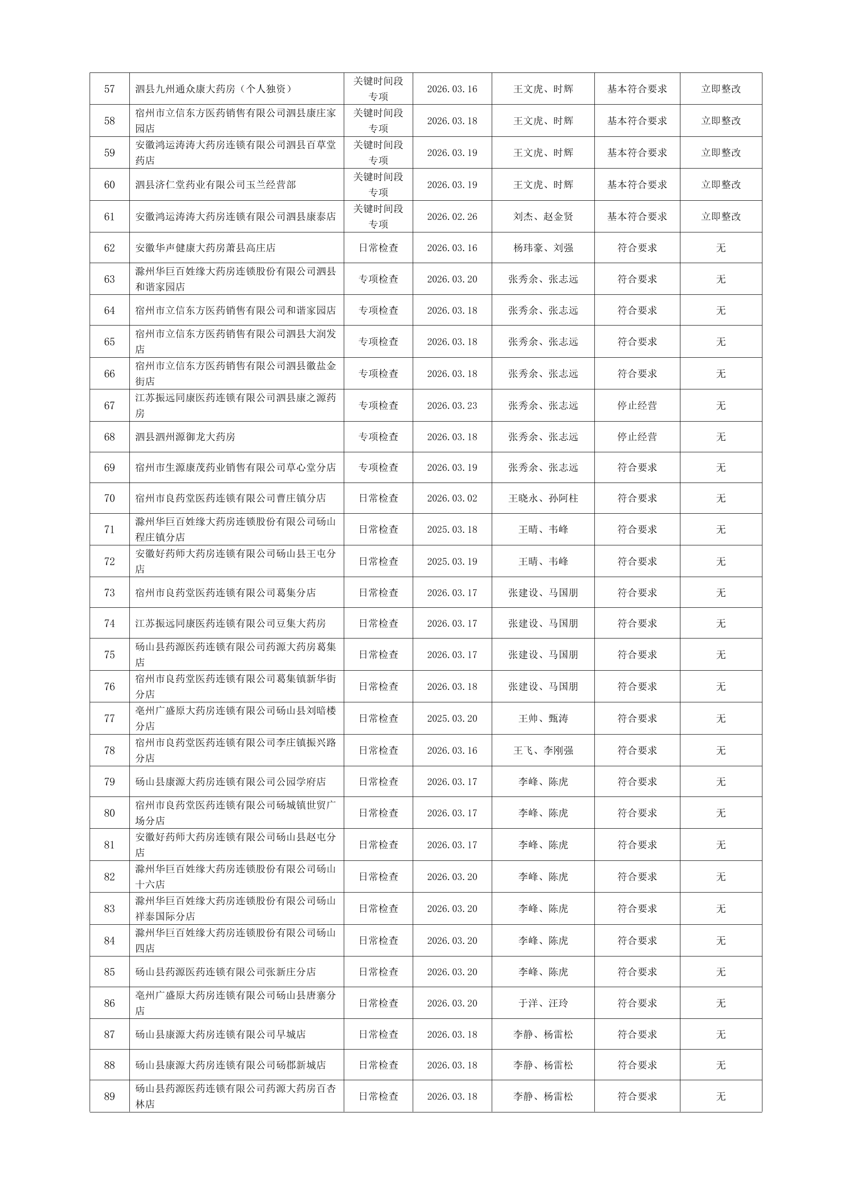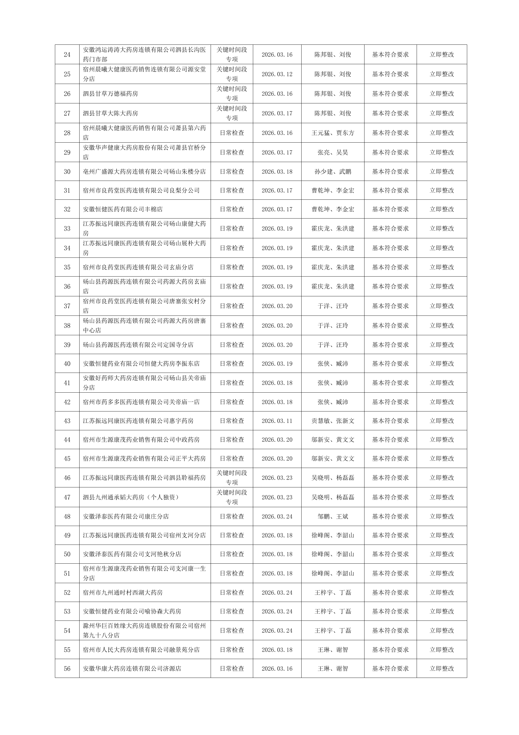 宿州市2026年3月份药品流通监督检查情况表